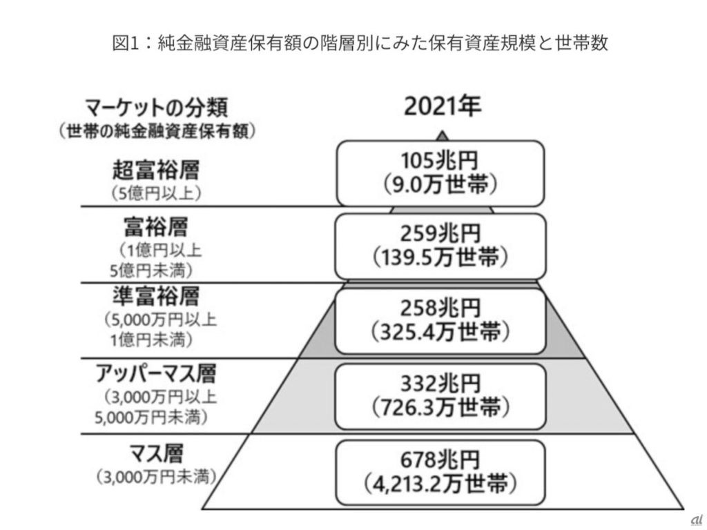 2021年のデータでは、アッパーマス層以上の世帯(図のマス層より上の4つの層)をすべて合計すると、約1,200万世帯になります。総世帯数が5500万世帯なので、これは、日本の総世帯数の約22%にあたります。